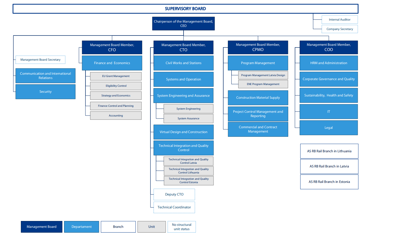RB Rail AS has clearly defined responsibilities, organized into two main management areas: core business functions and support functions.