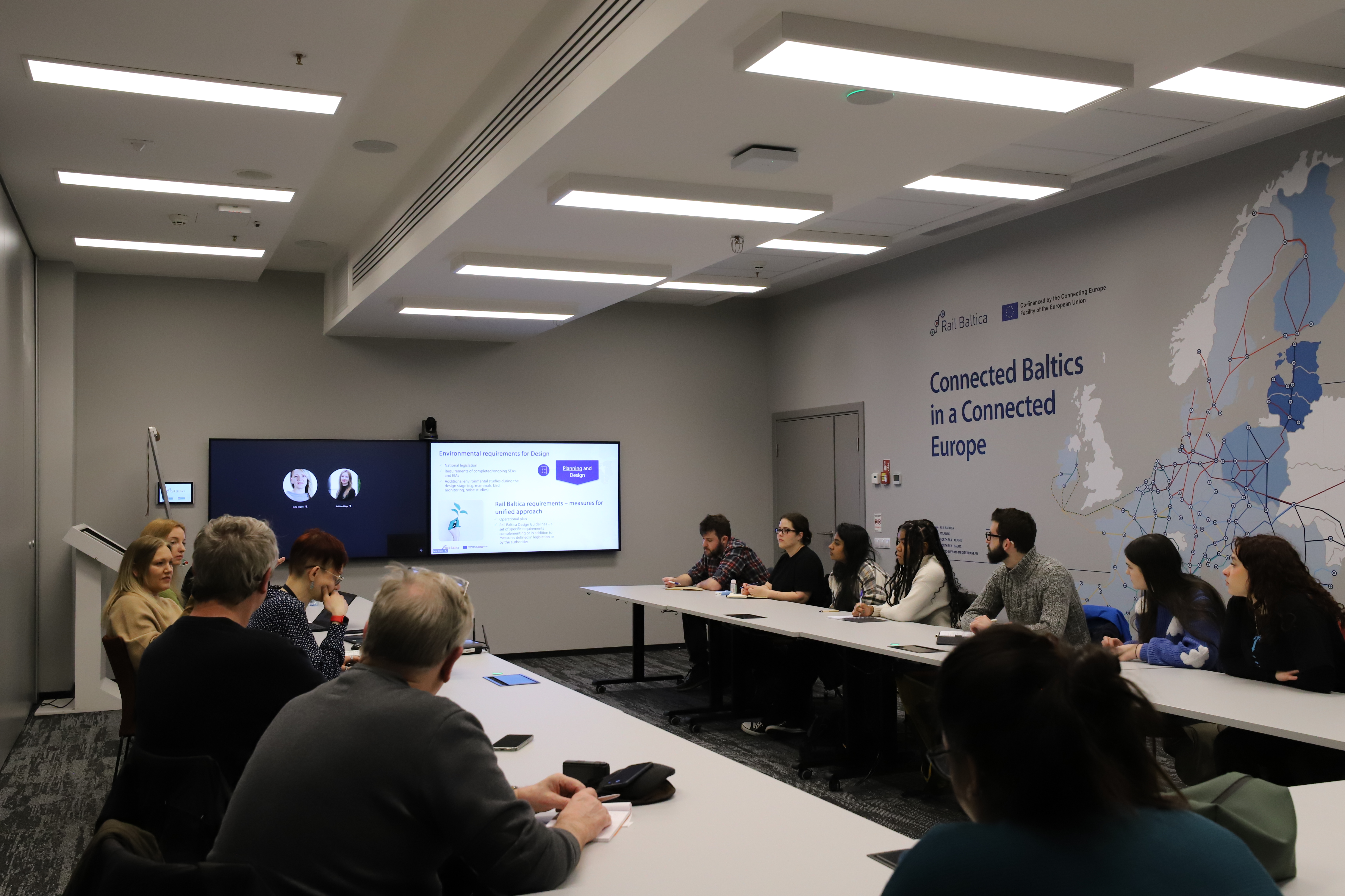 Kopā ar Rail Baltica teritoriālās plānošanas un vides komandu studenti pārrunāja iespējas un izaicinājumus, kas saistīti ar šāda mēroga pilnīgi jauna projekta būvniecību, kas aptver vairākas valstis un ir pakļauts virknei noteikumu un procedūru ar mērķi pēc iespējas mazāk ietekmēt vidi, tai skaitā iedzīvotājiem un viņu veselību. Studenti uzzināja, ka saistībā ar šiem jautājumiem projekta īstenotāji ņem vērā dažādus faktorus, kā, piemēram, troksnis un vibrācijas, dzīvnieku migrācija, floras un faunas aizsardzība, barjeras ietekmes mazināšana, dabiskās vides saglabāšana, ainavu īpatnības un infrastruktūras noturība klimata pārmaiņu apstākļos u.c.