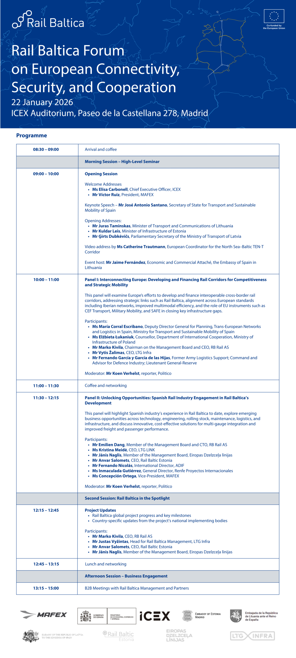 Organised by Rail Baltica together with ICEX Spain Trade and Investment, MAFEX, and the Embassies of Estonia, Latvia, and Lithuania in Spain, the forum will convene senior policymakers, representatives of European institutions, members of the diplomatic and defence communities, rail infrastructure managers, operators, and industry leaders.