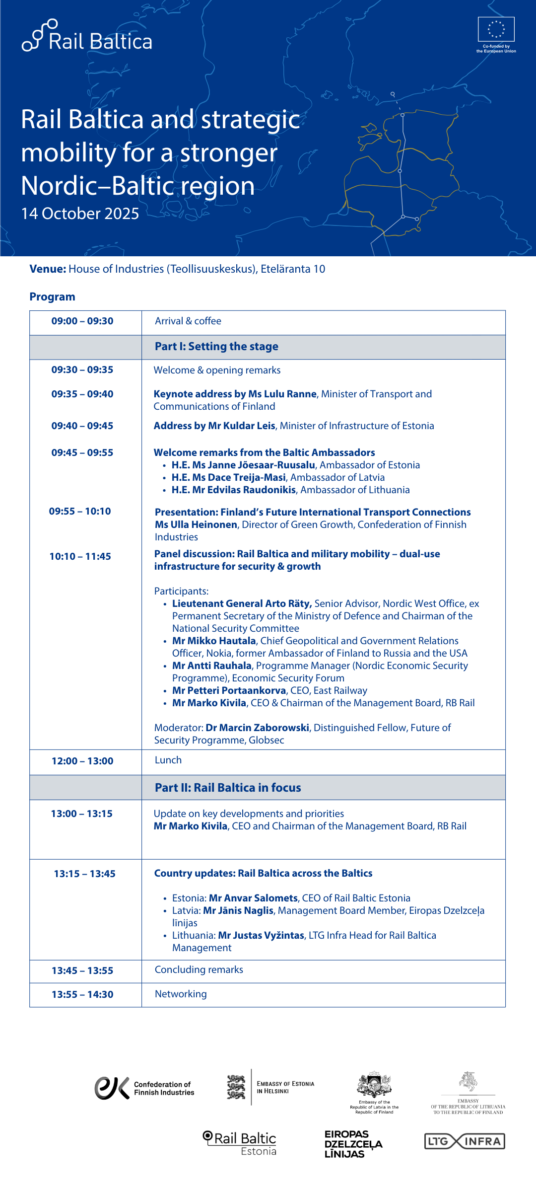 On 14 October 2025, a seminar dedicated to Rail Baltica will take place in Helsinki, Finland. The event will focus on Rail Baltica as a strategic infrastructure project that not only enhances Northern Europe’s connectivity and supports sustainable growth, but also strengthens the resilience of the Nordic–Baltic region through defence readiness, strategic mobility, and military logistics.